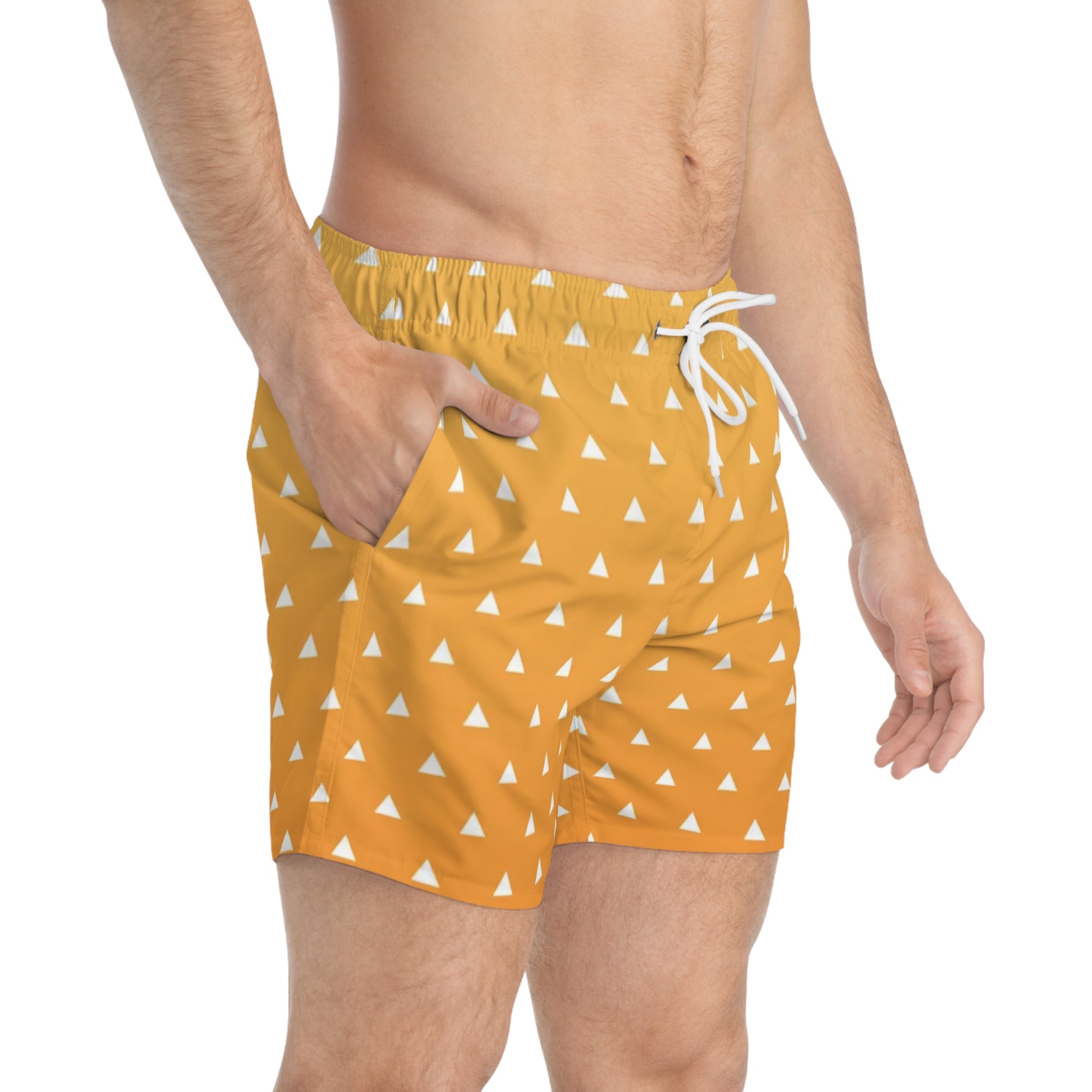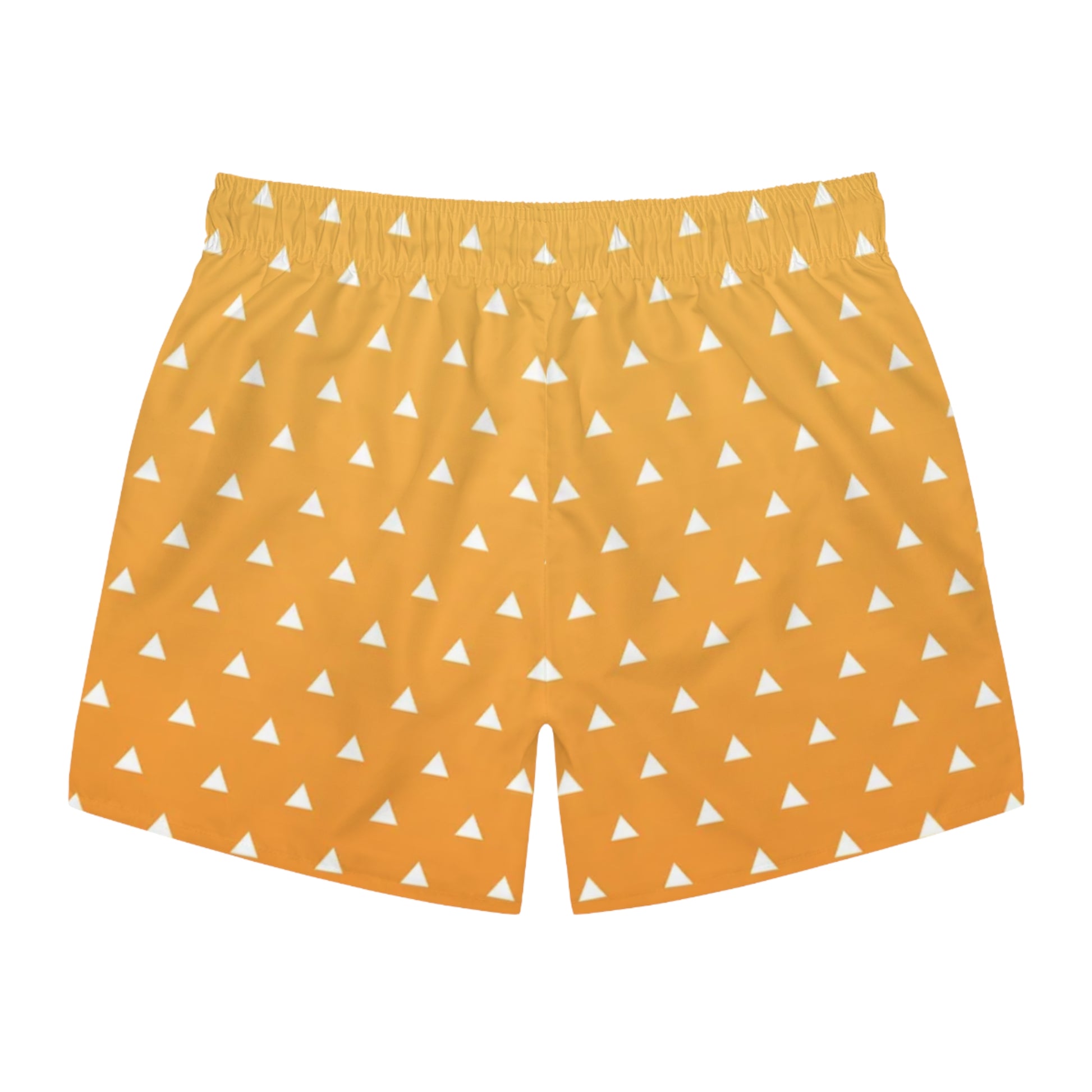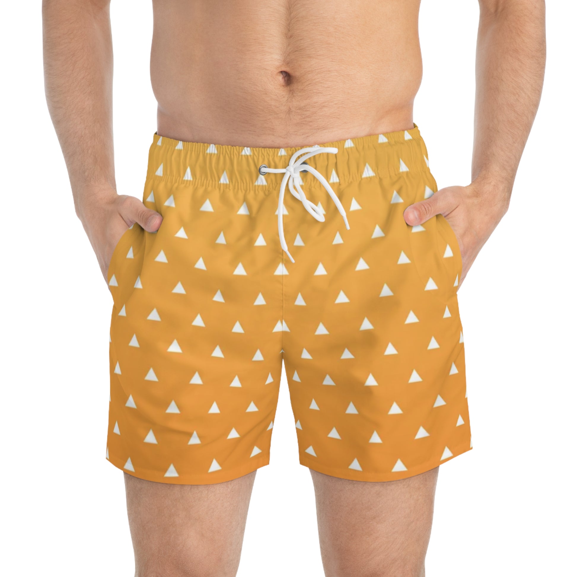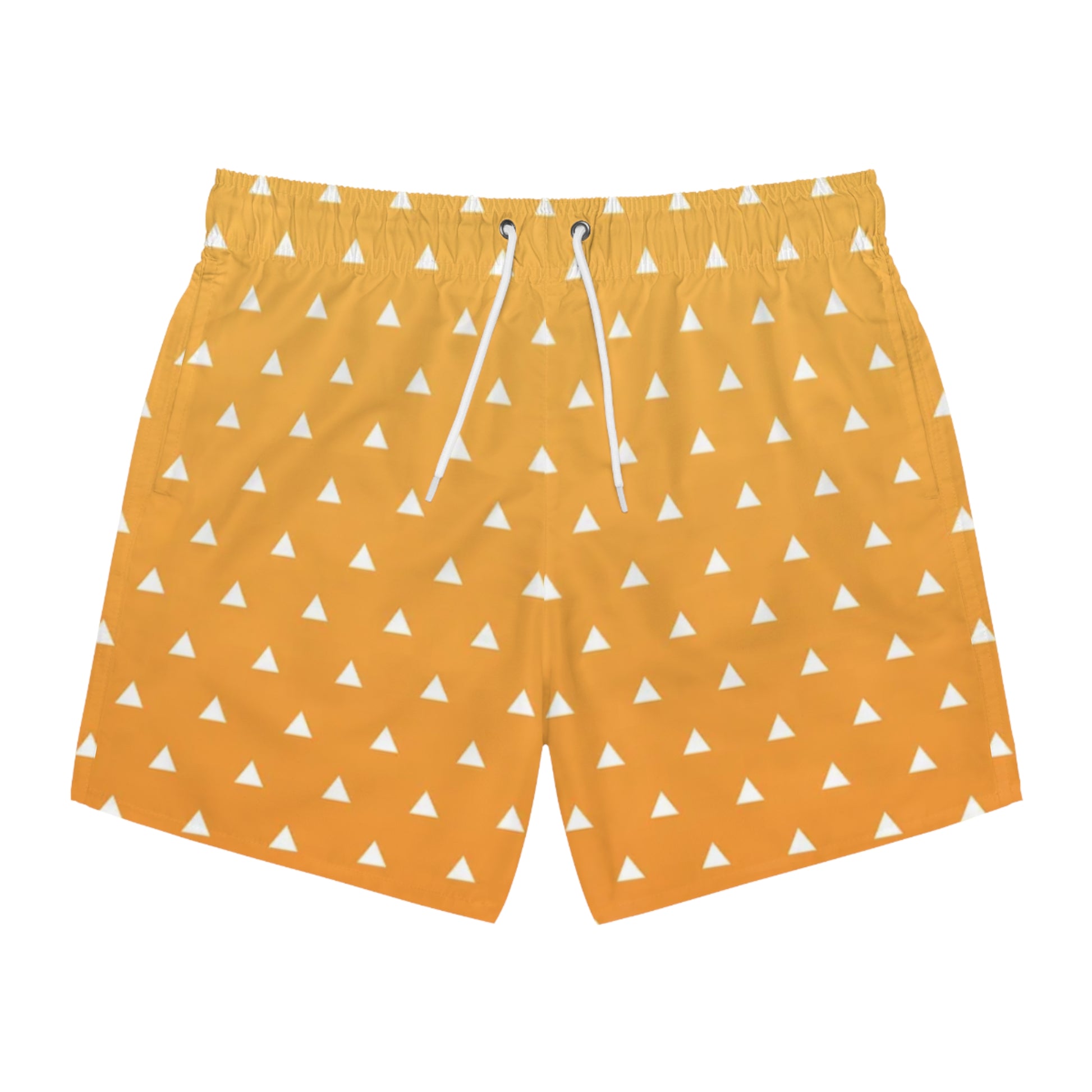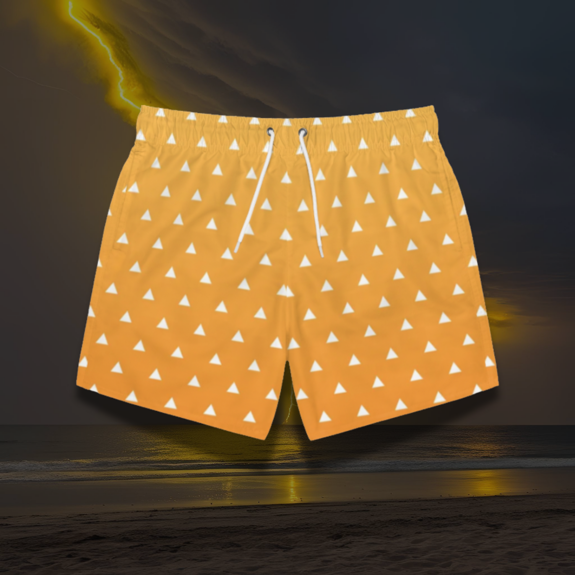Strike like lightning with these vibrant swim shorts inspired by Zenitsu Agatsuma, the Thunder Breathing warrior. With a bold orange-to-yellow gradient and crisp white triangle pattern, this design captures Zenitsu’s electric energy and unforgettable style. Whether you're poolside or on the beach, these shorts will have you standing out—in fear or flair is up to you!